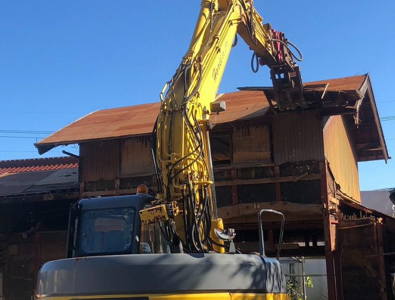 老朽化した木造建築の解体現場です。重機のアタッチメント(掴み機)を巧みに操り、廃棄物を分別しながら丁寧に作業を進めます。