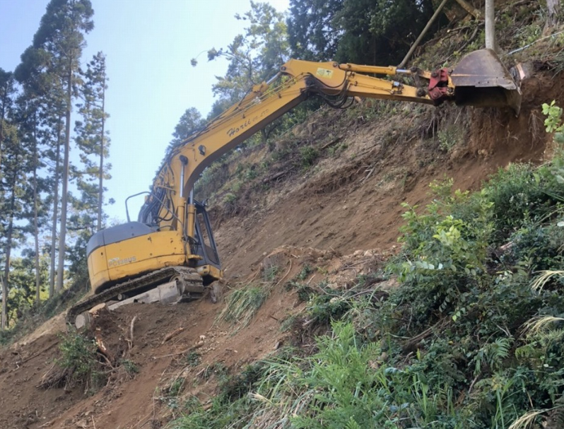 山間部や傾斜地での法面(のりめん)成形工事です。重機が入りにくい急斜面でも、熟練のオペレーターが正確に土を削り、土砂崩れを防ぐための安定した斜面を構築します。